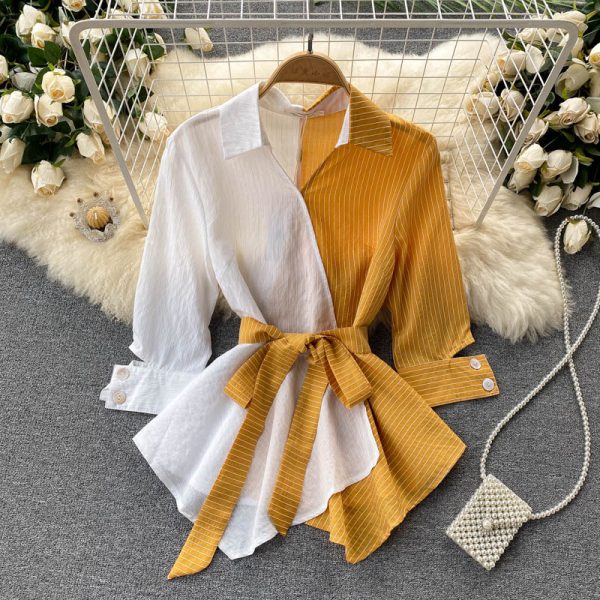 Vintage White Striped Patchwork Irregular Ruffle Blouse Women Spring Autumn Elegant Turn-Down Collar Tops Female Casual Shirt
