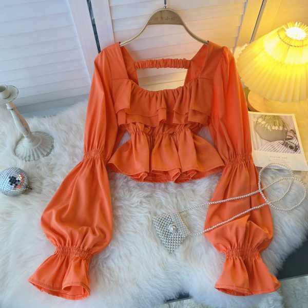 Sex Square Collar Flare Long Sleeve Ruffle Short Tops Women Autumn Elegant Casual Blue/Orange/Black/White Blouse Fashion