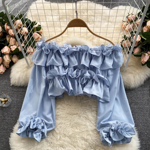 Blue/White Ruffle Slash Neck Sexy Blouse Women Elegant Flare Long Sleeve Chiffon Short Shirt Female Off Shoulder Tops Autumn New
