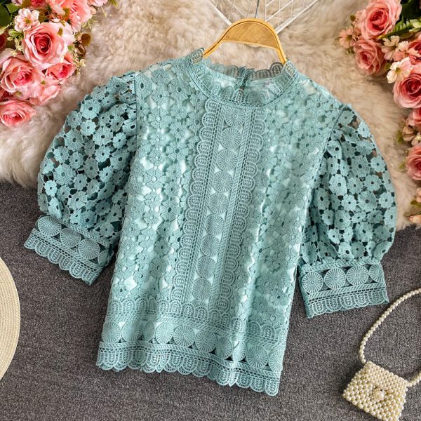 Green/Pink/Beige Hook Flower Hollow Blouse Women Vintage Stand Collar Puff Sleeve Short Tops Female Sweet Summer Blusas New