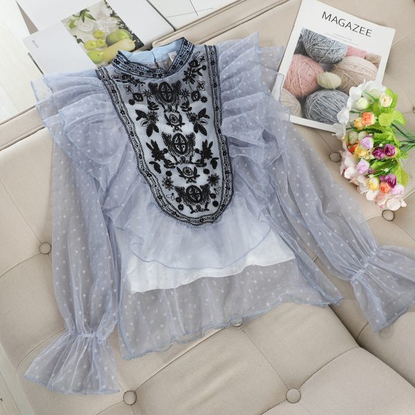 Black/White/Blue Embroidered Mesh Blouse Sweet Loose Flare Long Sleeve Polka Dot Ruffle Shirt Female Casual Blusas Autumn