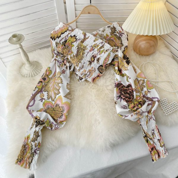 Sexy V-Neck Lantern Long Sleeve Floral Wrap Blouse Women Elegant Short Tops Female Casual Printed Slim Blusas New Fashion