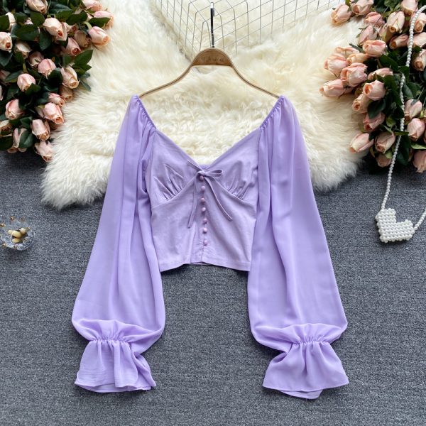 Purple/Yellow/Pink Sexy Blouse Women V-Neck Single Breasted Flare Long Sleeve Short Tops Female Elegant Beach Shirts Summer New