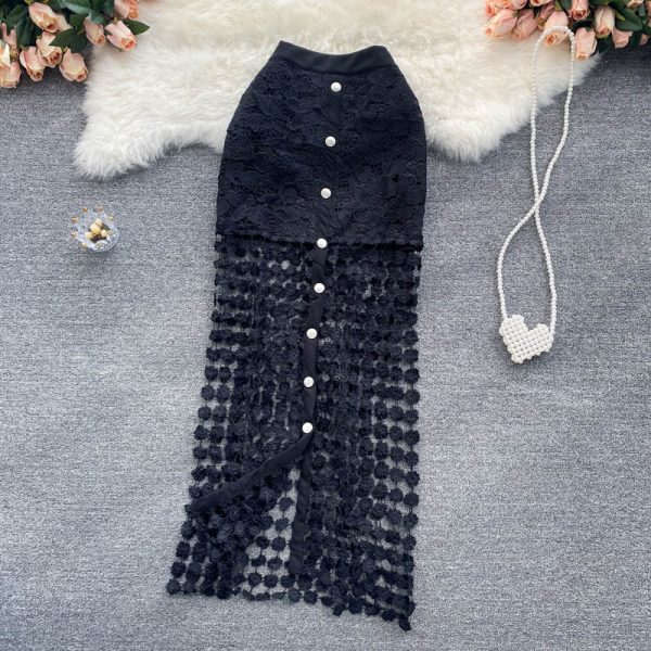 Sexy Black/White Hollow Out Lace Skirt Women Elegant Buttons Patchwork Party Faldas Female High Waist Saias Summer New