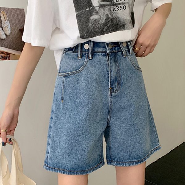 Vintage Fashion High Waist Slim Beige/Blue Denim Shorts Summer Loose Wide Leg Pockets Casual Knee-length Jeans For Female