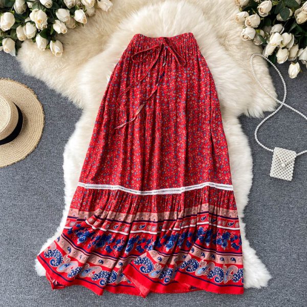 Bohemian Flower Printed Midi Skirt Women Autumn Elegant High Elastic Waist Faldas Female Vacation Beach Pleated Saias New