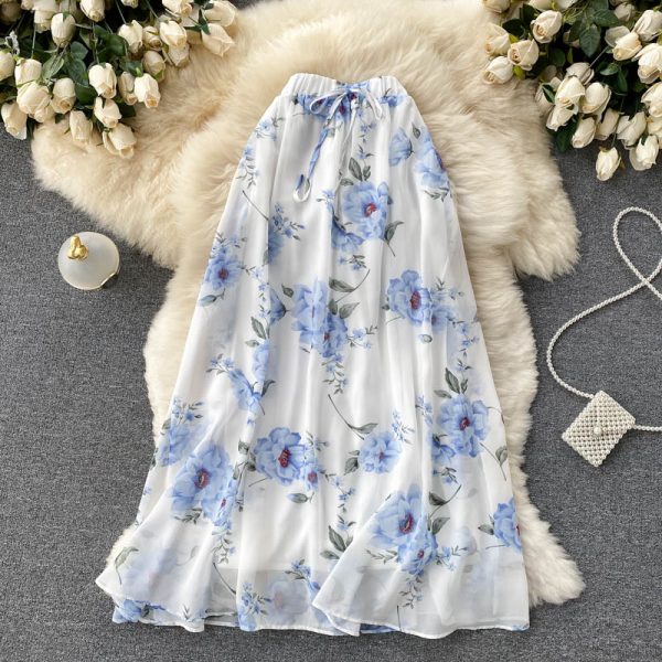 Autumn Sweet Blue Floral Printed Chiffon Long Skirt Women Casual High Waist Drawstring A-Line Faldas Female Saias Fashion