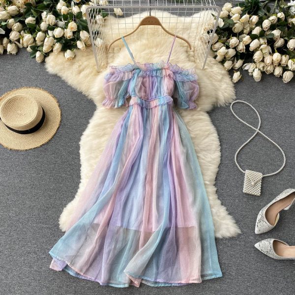Sexy Women Spaghetti Strap Mesh Midi Dress Summer Elegant Off Shoulder Rainbow Striped Colorful Beach Vestidos Female Robe