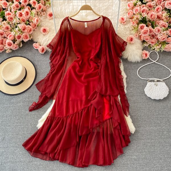 Sexy Red Irregular Chiffon Midi Dress Women Elegant Vacation Beach Party Spaghetti Strap Vestidos With Shawl Summer Ruffle Robe