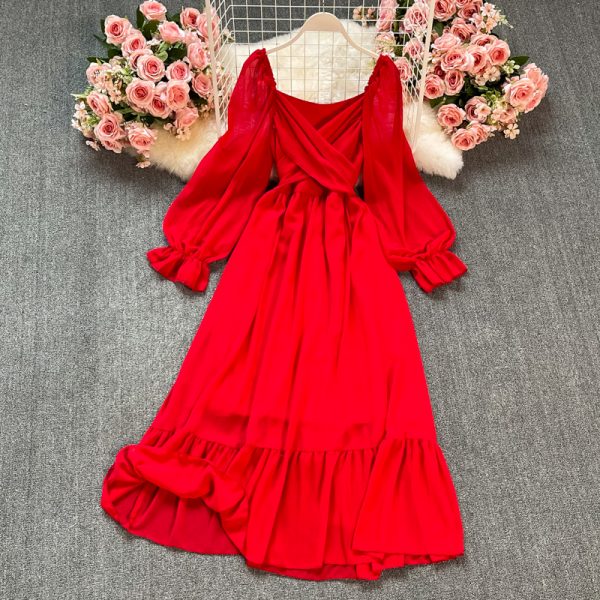 Sexy Red/White Long Dress Women Beach Holiday Vestidos Elegant V-Neck Puff Sleeve High Waist Bandage Robe Spring Summer