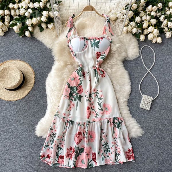 Summer Bohemian Women Floral Midi Dress Beach Vacation Spaghetti Strap Vestidos Female White Strapless Camisole Robe New