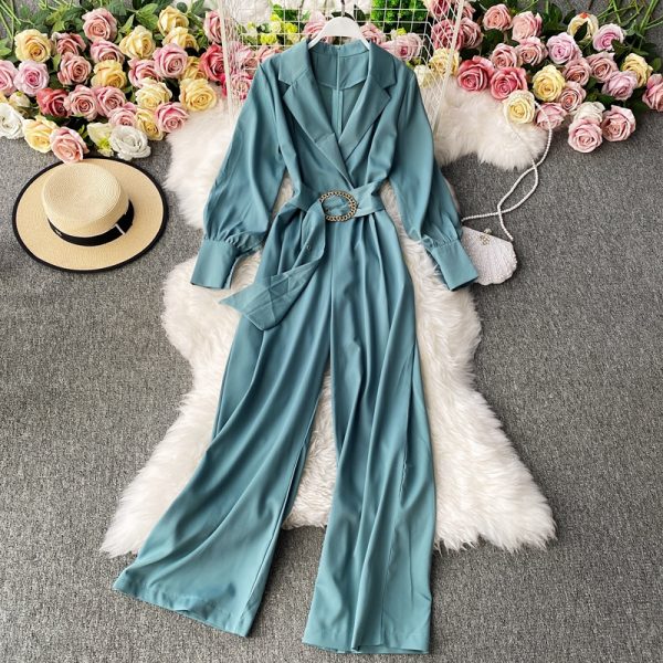 Office Lady Rompers Autumn Notched Collar Long Sleeve Wide Leg Jumpsuit Female Solid Yellow/Blue Playsuits Fashion Fall New