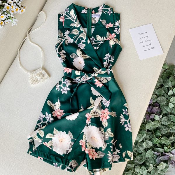 Summer Blue/Pink/Green Flower Floral Jumpsuits Women Sleeveless Notched Collar Rompers Female Sashes Wide Leg Boho Romper