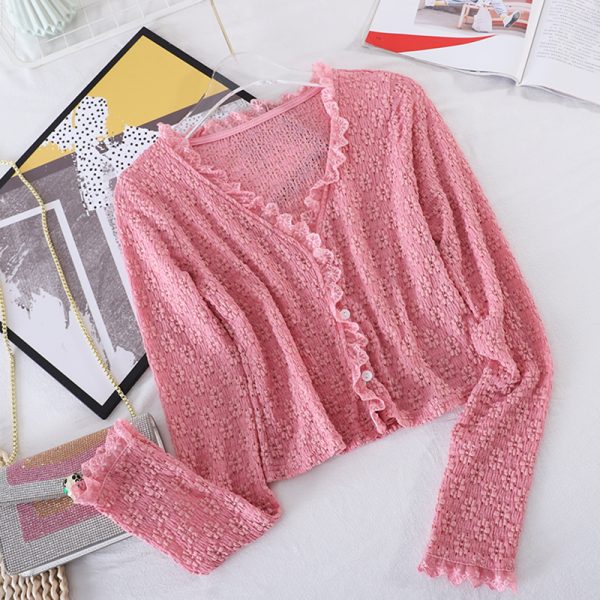 Sexy Lace Ruffle Single Breasted Short Blouse For Women Summer Elegant V-Neck Long Sleeve Draped Shirt Female Casual Blusas