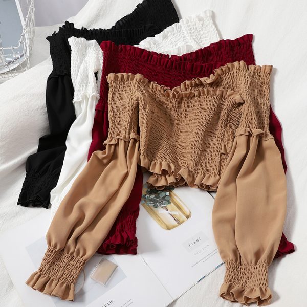 Sexy Slash Neck Short Tops Women Ruffle Long Sleeve Khaki/White Shirts Casual Slim Off Shoulder Tops Female New Fashion