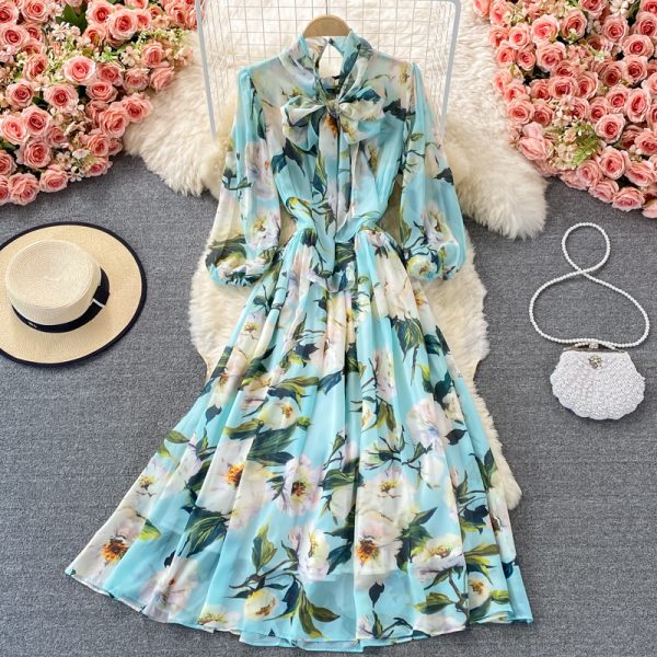 Bohemian Blue Floral Chiffon Long Dress For Women Bow Collar Puff Long Sleeve Vestidos Vacation Beach Party Maxi Robe New