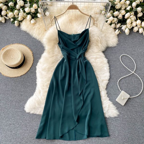 Sexy Green/Black Spaghetti Strap Dress Women Casual Twist High Waist Sleeveless Irregular Vestidos Female Summer Party Robe