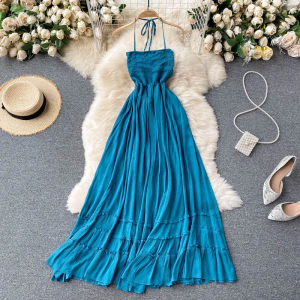 Sexy Blue Spaghetti Strap Long Dress Women Beach Holiday Open Back High Waist Strapless Vestidos Elegant A-Line Robe Summer