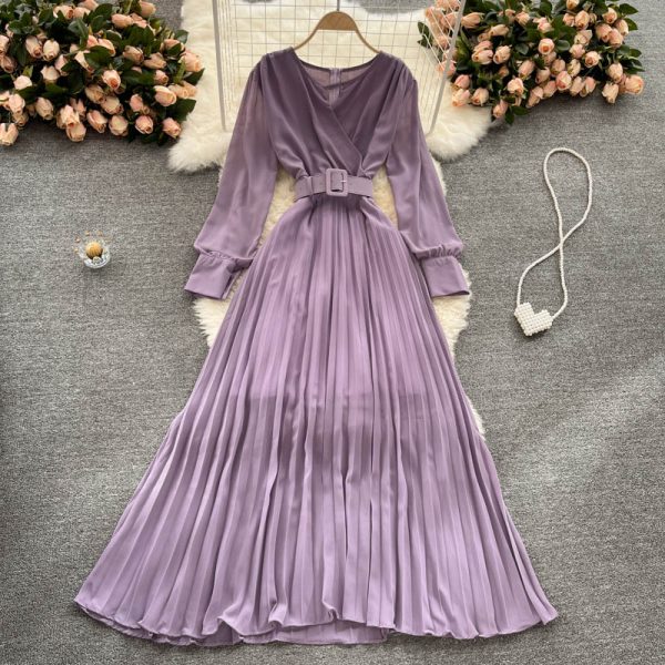 Purple/Red Chiffon Pleated Long Dress Women Lantern Sleeve Round Neck Hollow Out Vestidos Female Vintage Robe Spring Autumn