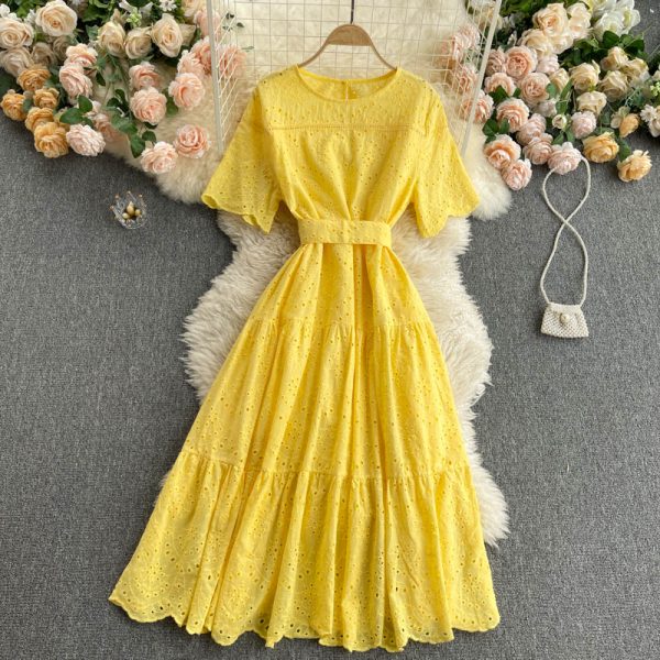 Purple/Blue/Yellow Hollow Out Embroidery Midi Dress Women Vintage Round Neck Short Sleeve High Waist Vestidos Vacation Beach New