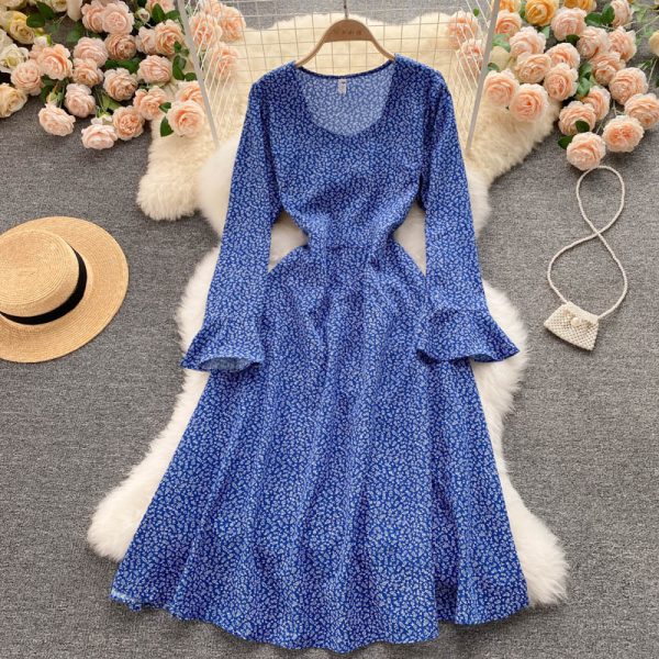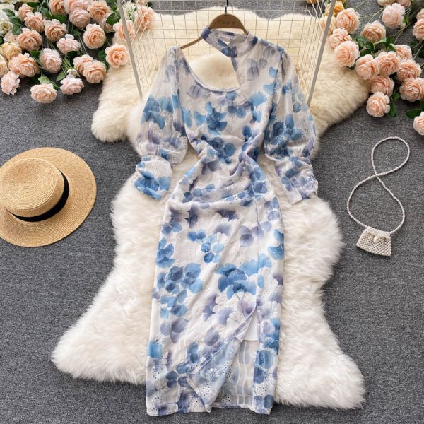 Vintage Blue Floral Long Dress Casual Round Neck Long Sleeve High Waist Slim Elegant Maxi Dresses Female Robe Mujer Autumn
