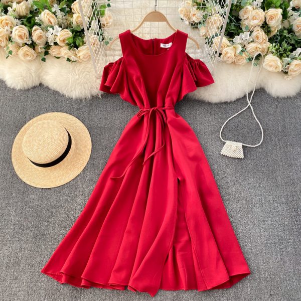 Vintage Off Shoulder Short Sleeve Women’s Midi Dress Elegant O-Neck Ruffle High Waist Party Vestidos Female Slim Robe Fashion