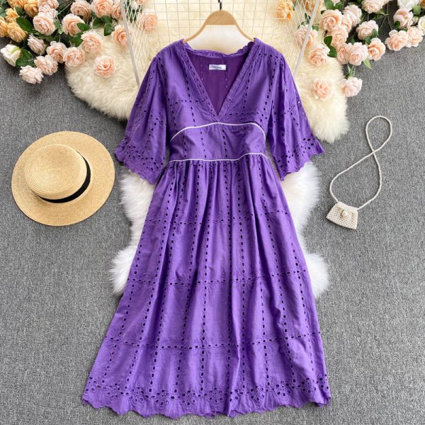 Vintage Purple Hollow Out Midi Dress Women Sexy V-Neck Vacation Beach Party Vestidos Female Runway Loose Robe Summer New