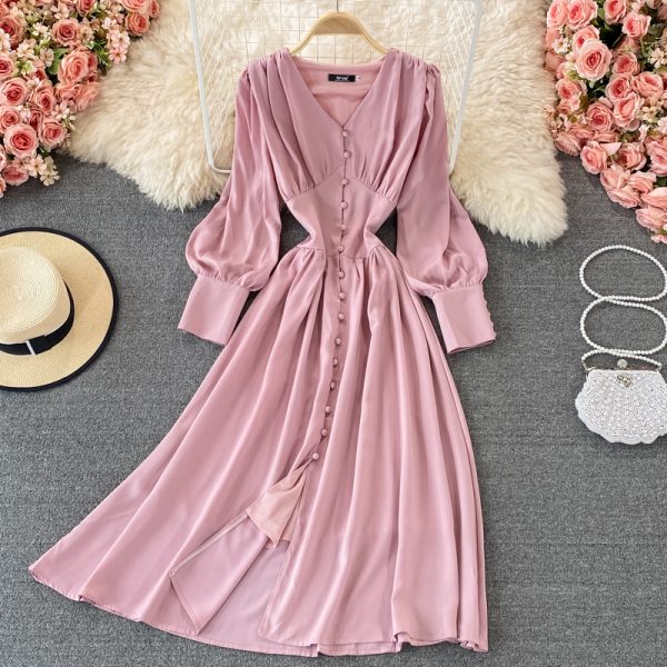 Vintage Pink/White Single Breasted Long Dress Women Summer Elegant V-Neck Lantern Sleeve High Waist Party Vestidos Spring Autumn