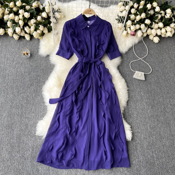 Vintage Purple Dress Women Elegant Ruffle Turn-Down Collar High Waist A-Line Casual Vestidos With Sashes Female Summer Plus Size