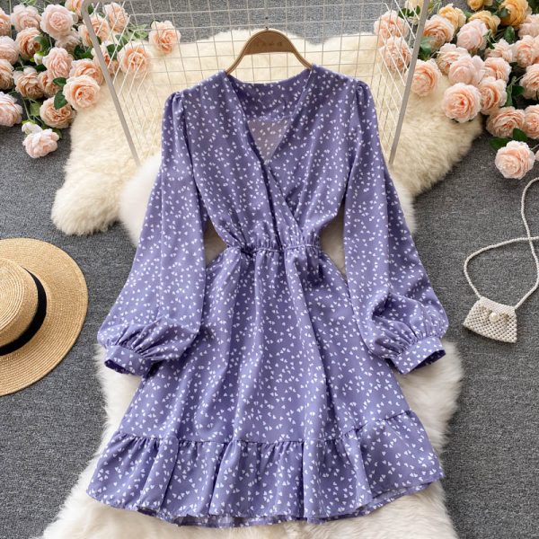Vintage Purple/Red/Black Printed Ruffle Mini Dress Women Casual V-Neck Puff Long Sleeve A-Line Vestidos Female Autumn New