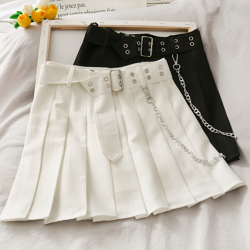 Korean Style Black/White Pleated Skirt For Women High Waist Chain Decor Draped Mini Skirts With Belt Female Fashion Faldas