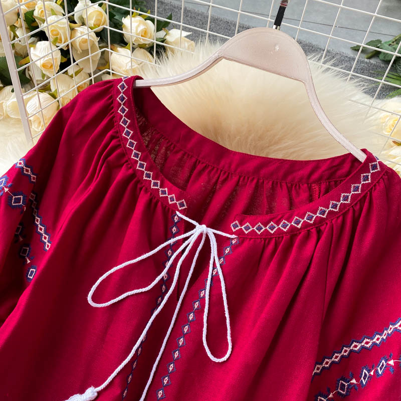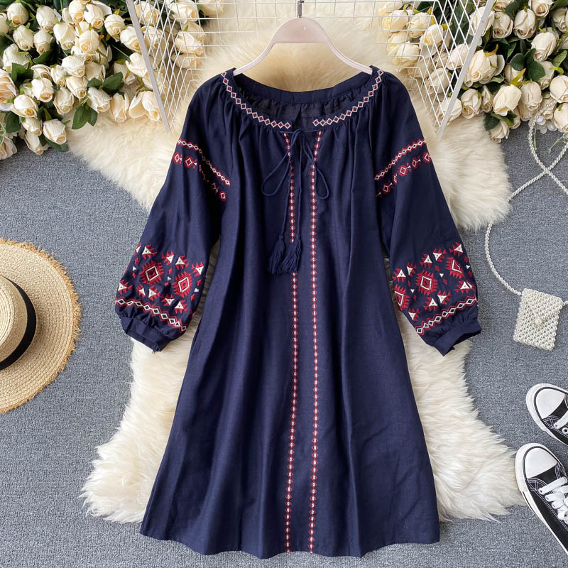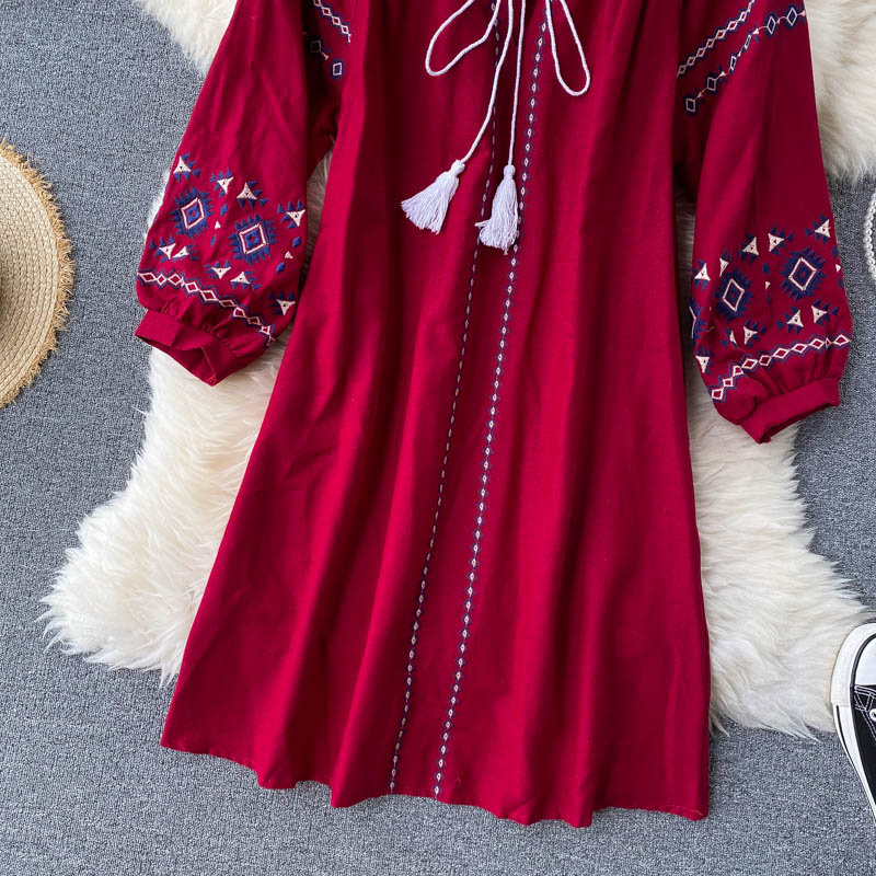 Bohemian Embroidery Mini Dress Autumn Round Neck Drawstring Puff Long Sleeve Loose Vestidos Red/White Dresses New