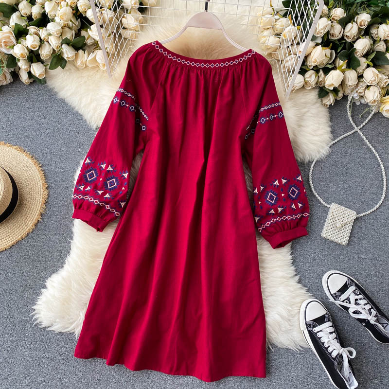 Cheap Dresses, Buy Quality Women’s Clothing Directly from China Suppliers:Bohemian Embroidery Mini Dress Autumn Round Neck Drawstring Puff Long Sleeve Loose Vestidos Red/White Dresses New