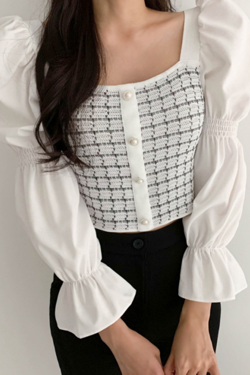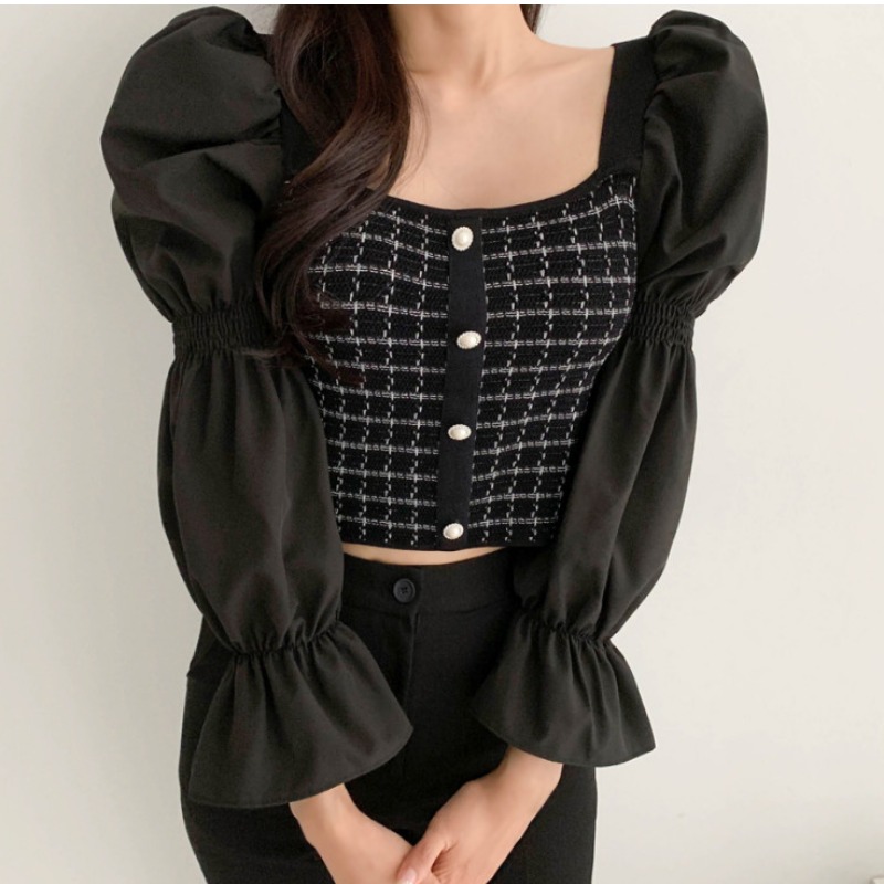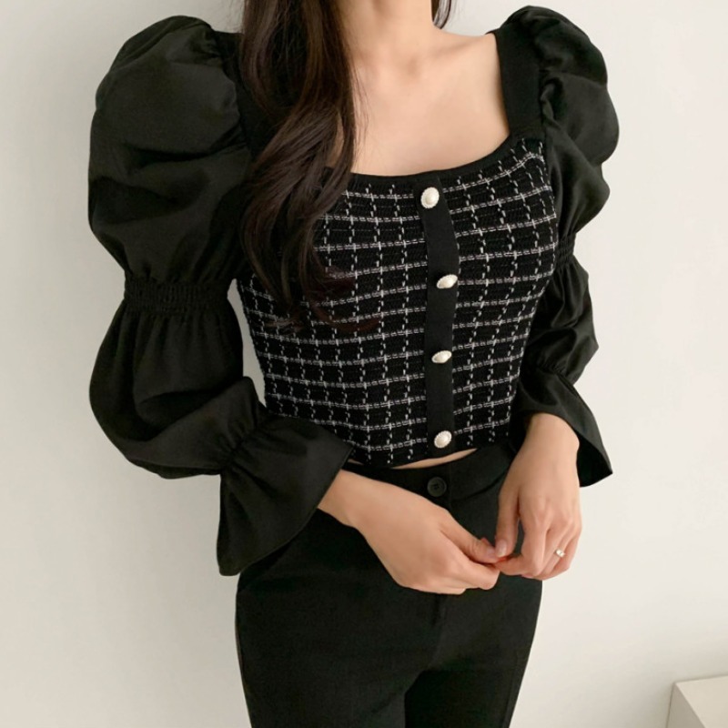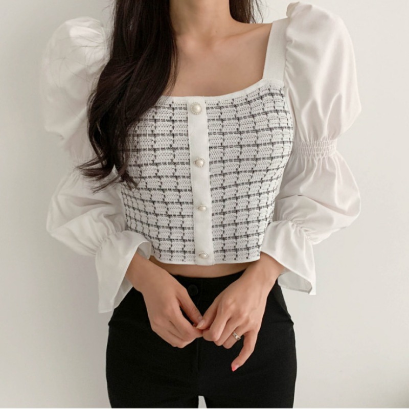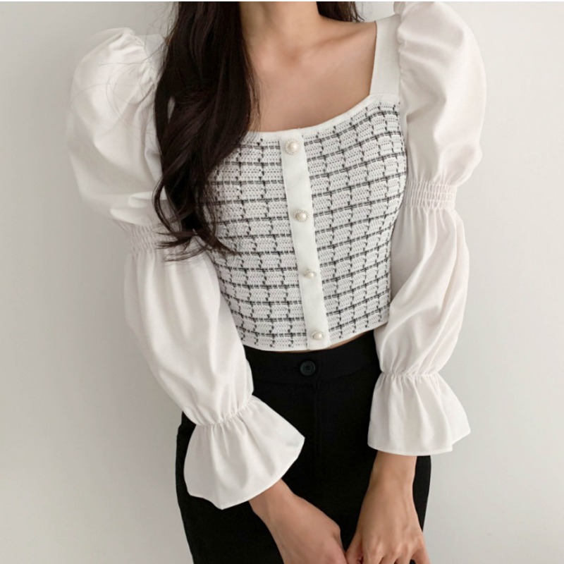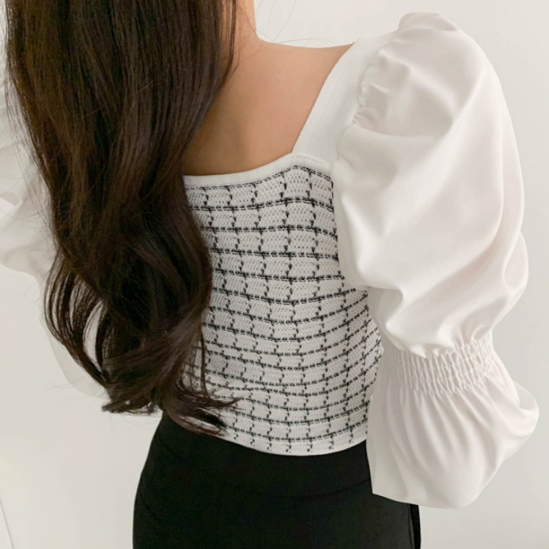 Autumn Casual Knitted Patchwork Shirt For Women Sexy Square Collar Slim Fit Short Blouse Flare Sleeve Tops Femme Blusas New