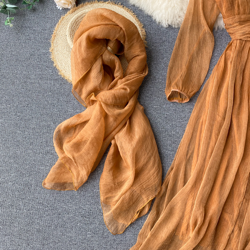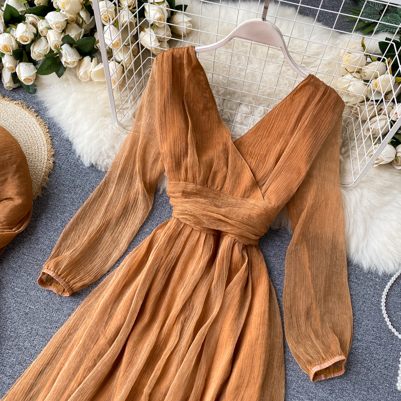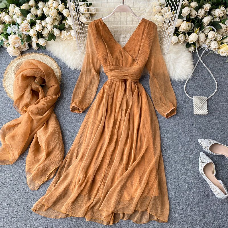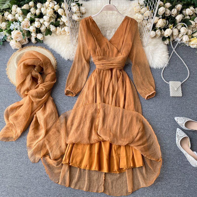 Sexy Deep V-Neck Long Sleeve Chiffon Dress Women Vintage High Waist Female Dresses With Scarf New Fashion Vestidos Autumn