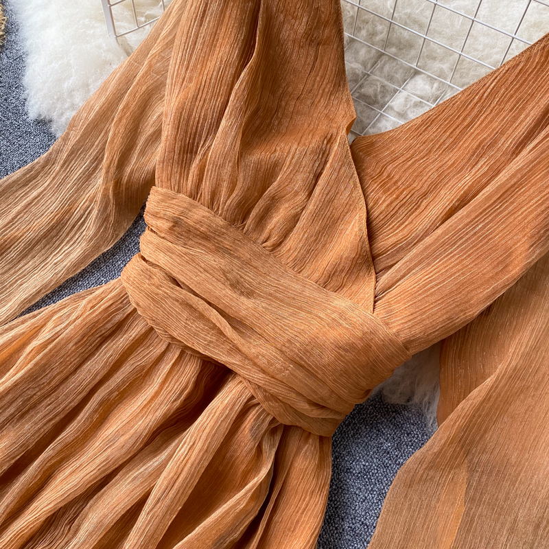 Vintage Purple/Yellow/Beige Pleated Long Dress Spring Autumn Elegant Round Neck Long Sleeve Draped Vestidos Female Robe New