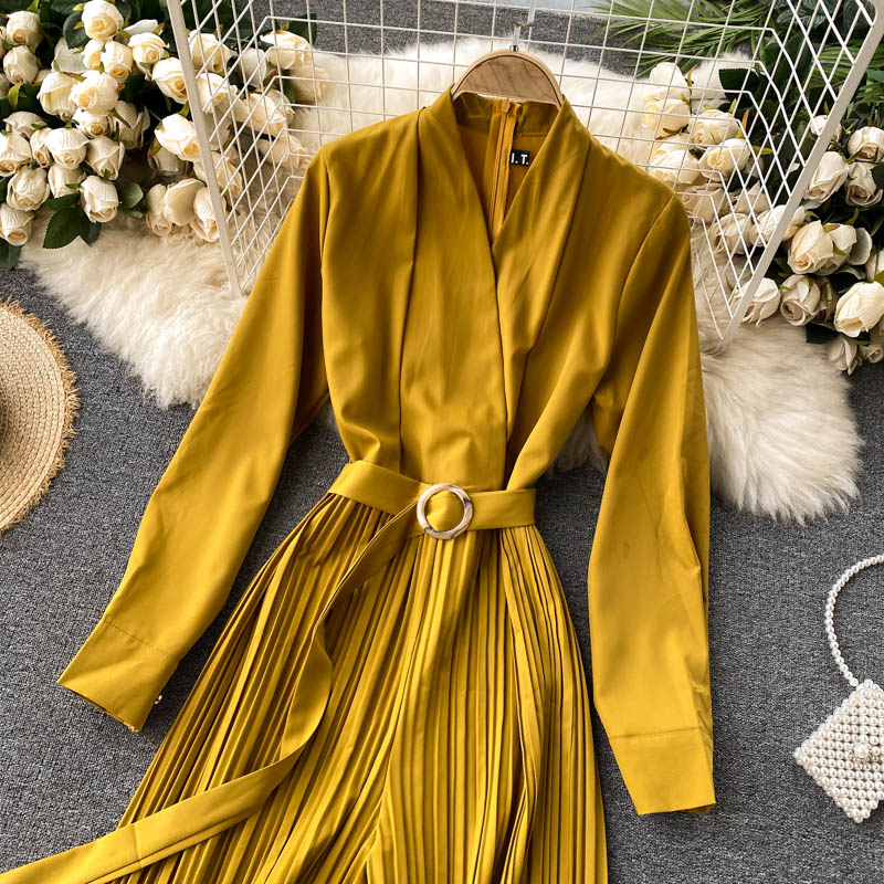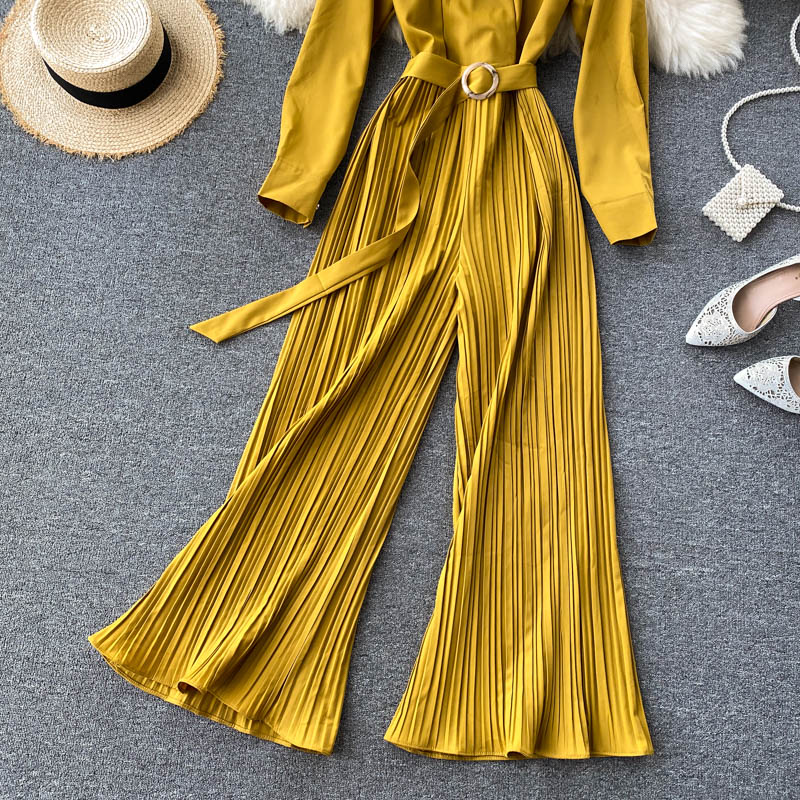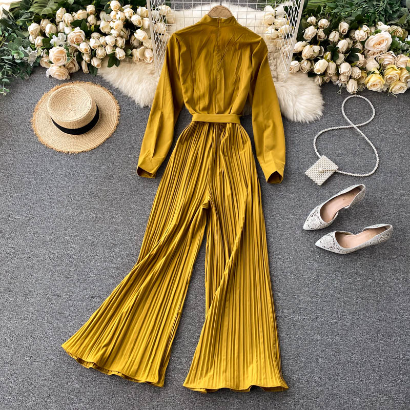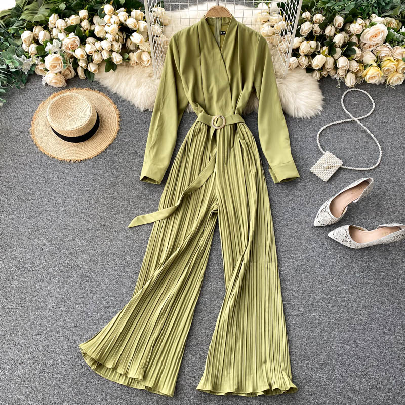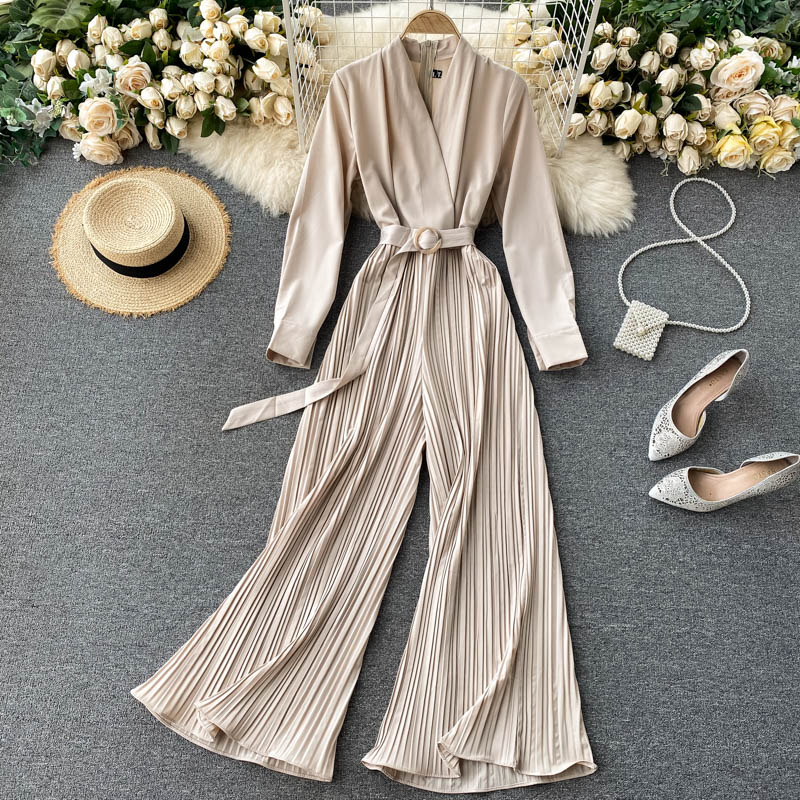 Autumn Winter Women’s Pleated Romper Elegant Solid Beige/Red V-Neck Draped Jumpsuit Female High Waist Playsuit New Fashion