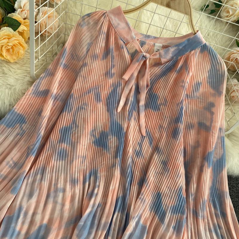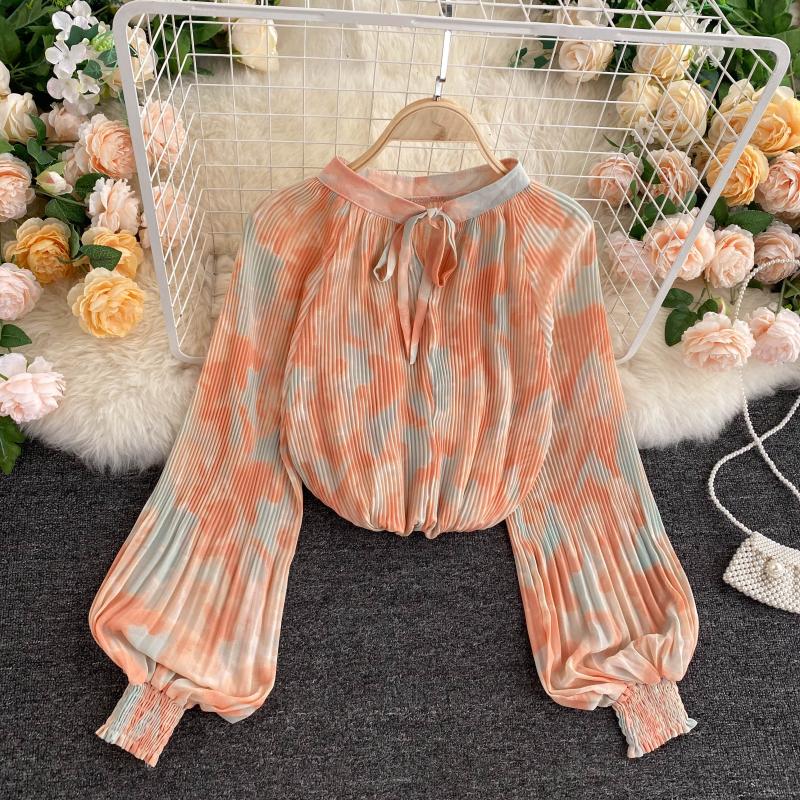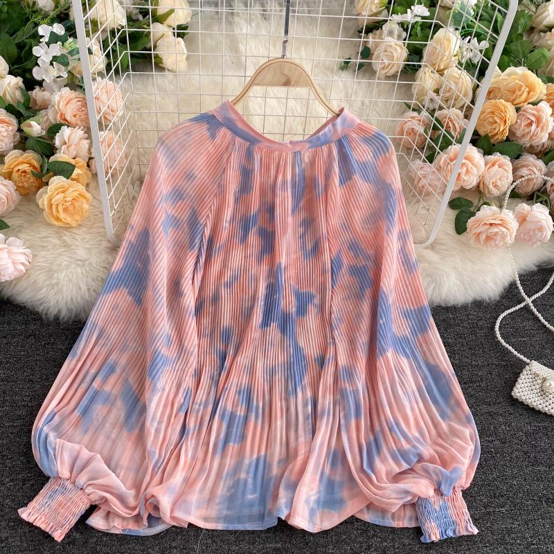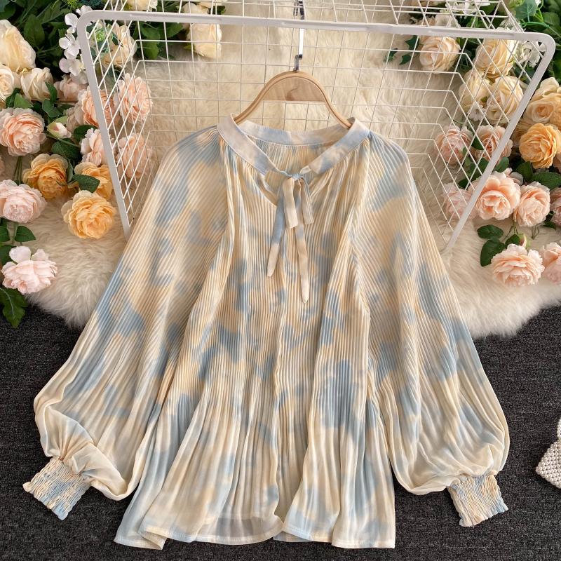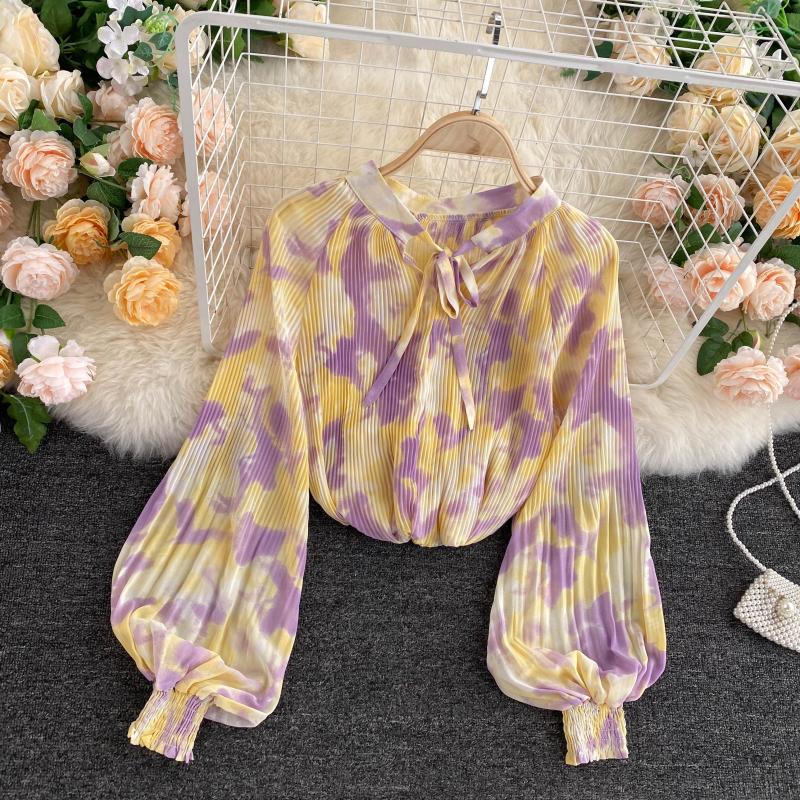 Yellow/Pink/Beige Dye Tie Pleated Chiffon Blouse Women Autumn Casual Draped Shirt Female Puff Long Sleeve Tops New Fashion