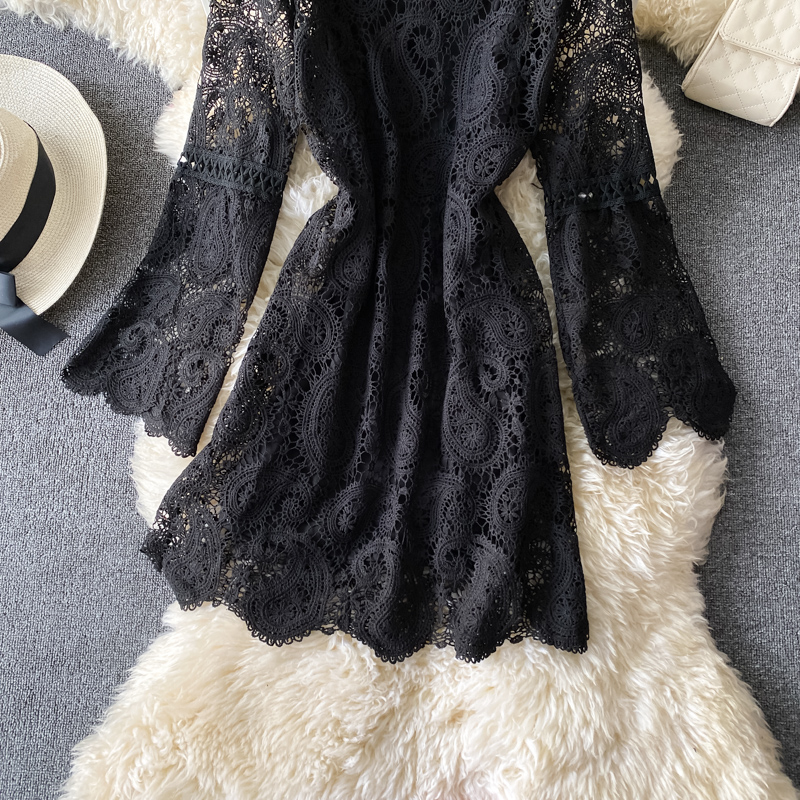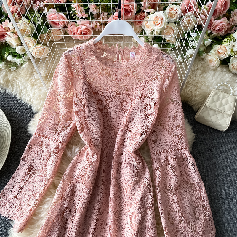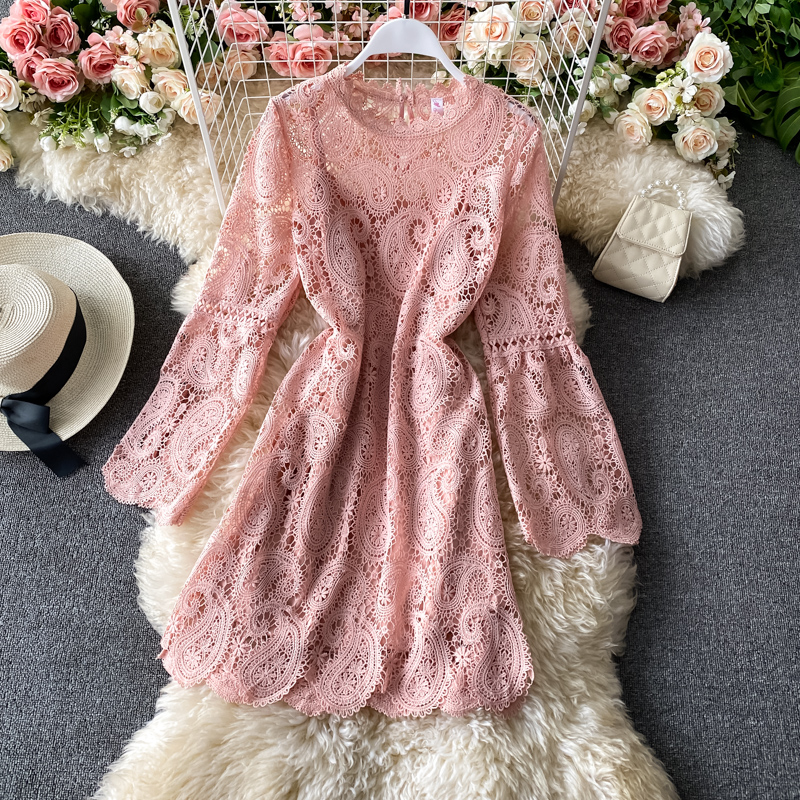 Sweet Pink/Black/White Lace Hollow Out Mini Dress Women Autumn Elegant Round Neck Long Sleeve A-Line Vestidos Female Robe