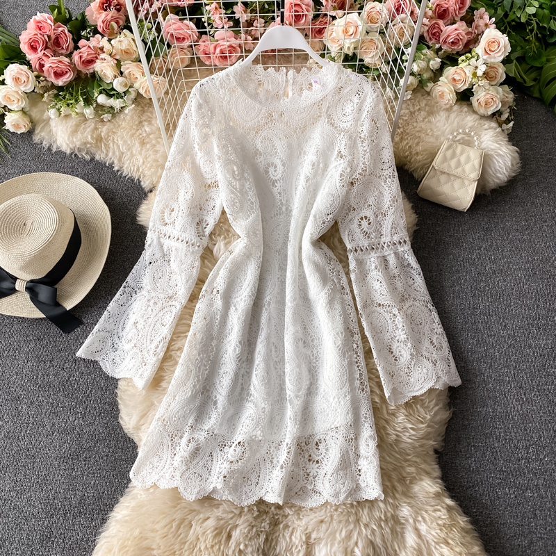 Vintage Round Neck White Hollow Out Lace Dress Women Casual High Waist Flare Long Sleeve A-Line Robe Female Vestidos Autumn