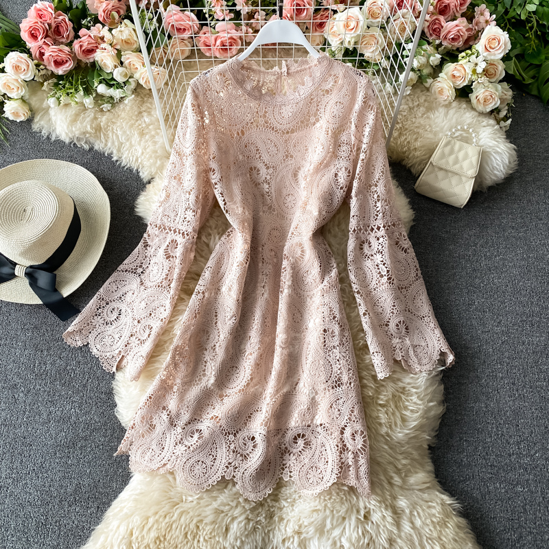 Autumn Winter Pink/White/Beige Hollow Out Party Dress Women Vintage Robe O-Neck Flare Long Sleeve High Waist Vestidos New