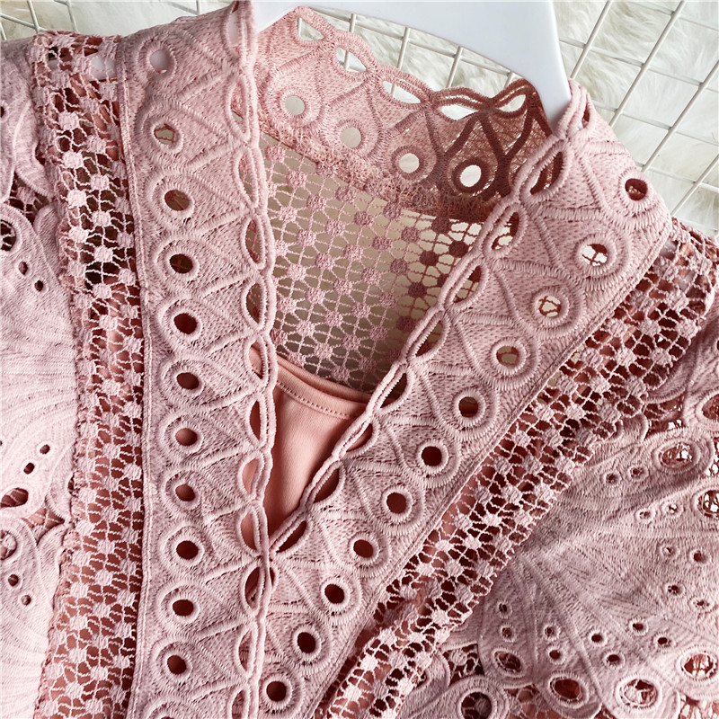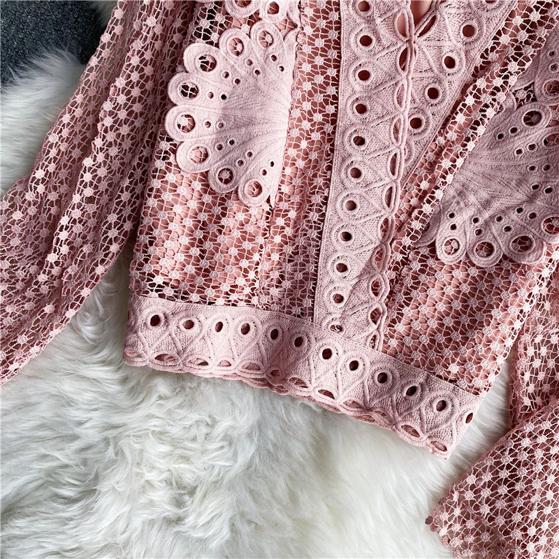 Autumn Sexy V-Neck Hollow Out Lace Blouse Women Casual Pink/White/Red Shirts Female Elegant Long Sleeve Tops New Fashion Blusas