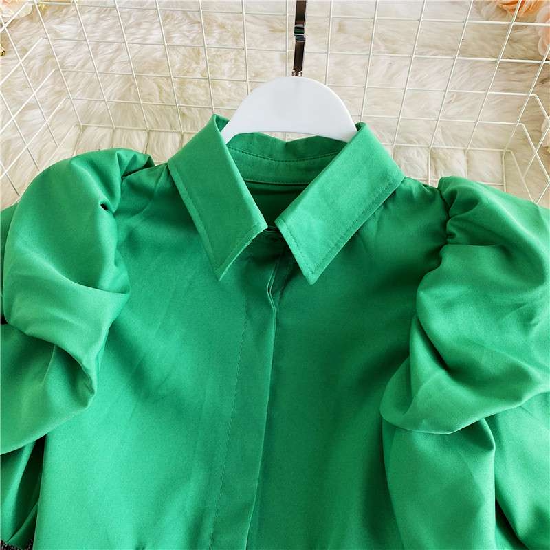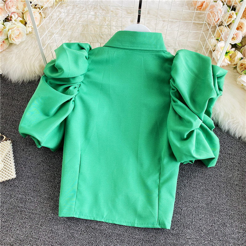 Vintage Green/Black/White Blouse Women Casual Turn-Down Collar Puff Short Sleeve Tops Female Slim Shirts Autumn New Blusas