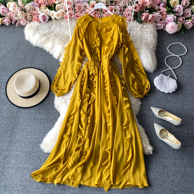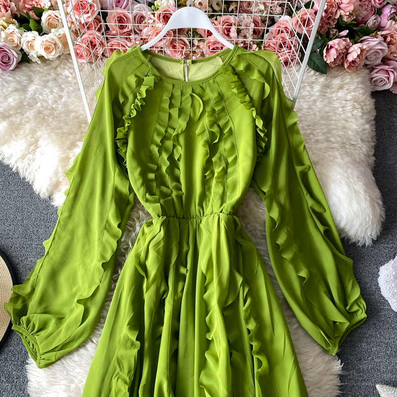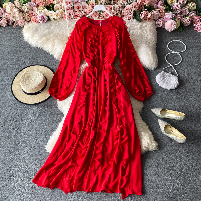 Autumn Winter Solid Green/Red/Pink Chiffon Long Dress Women Elegant Round Neck Long Sleeve Loose Vestidos Female Fashion Robe