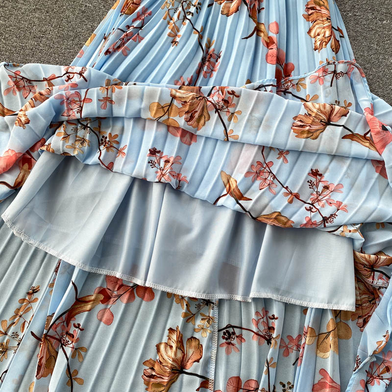 Boho Chic Women Floral Draped Long Dress Vacation Beach Party Vestidos Female Round Neck Sleeveless Pleated Robe Spring Autumn