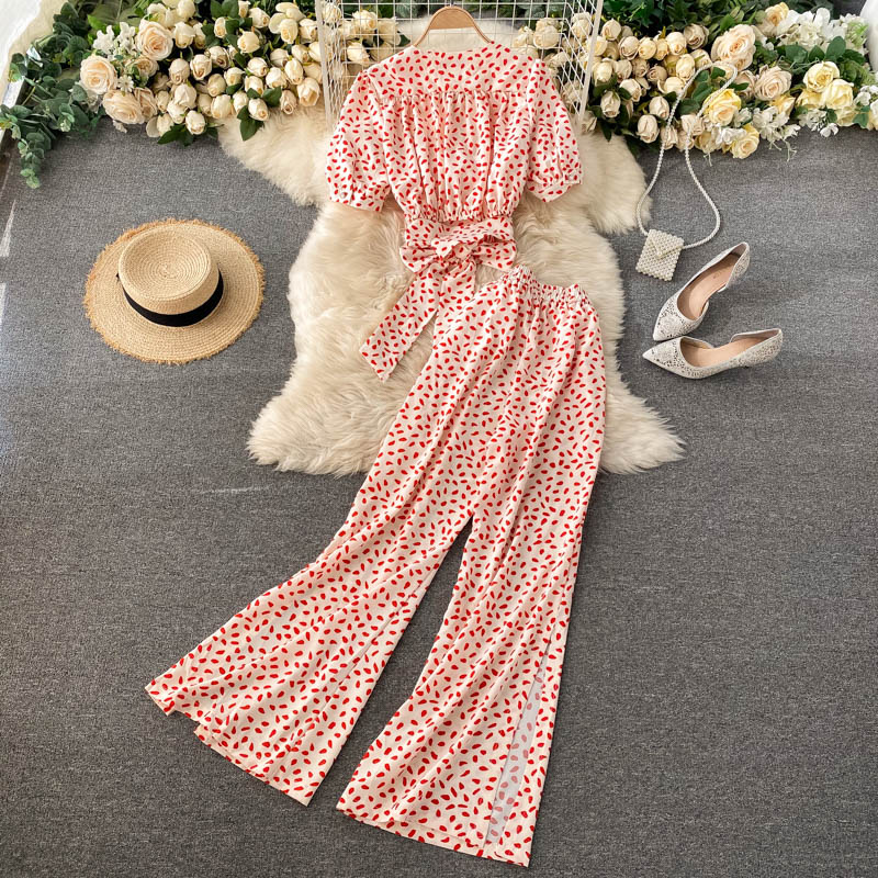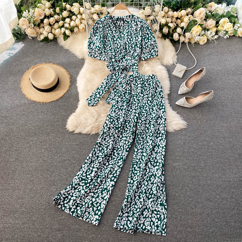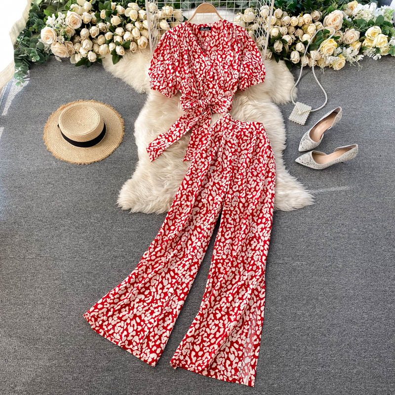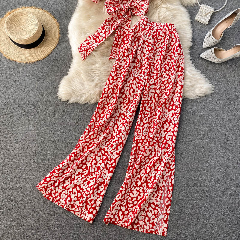 Spring Autumn Women Printed Two Piece Set Beach Vacation Party Sexy V-Neck Bandage Short Tops + High Waist Wide Leg Pants Suit