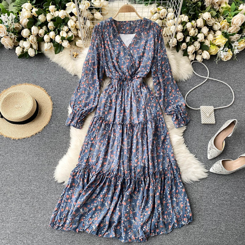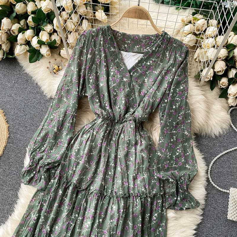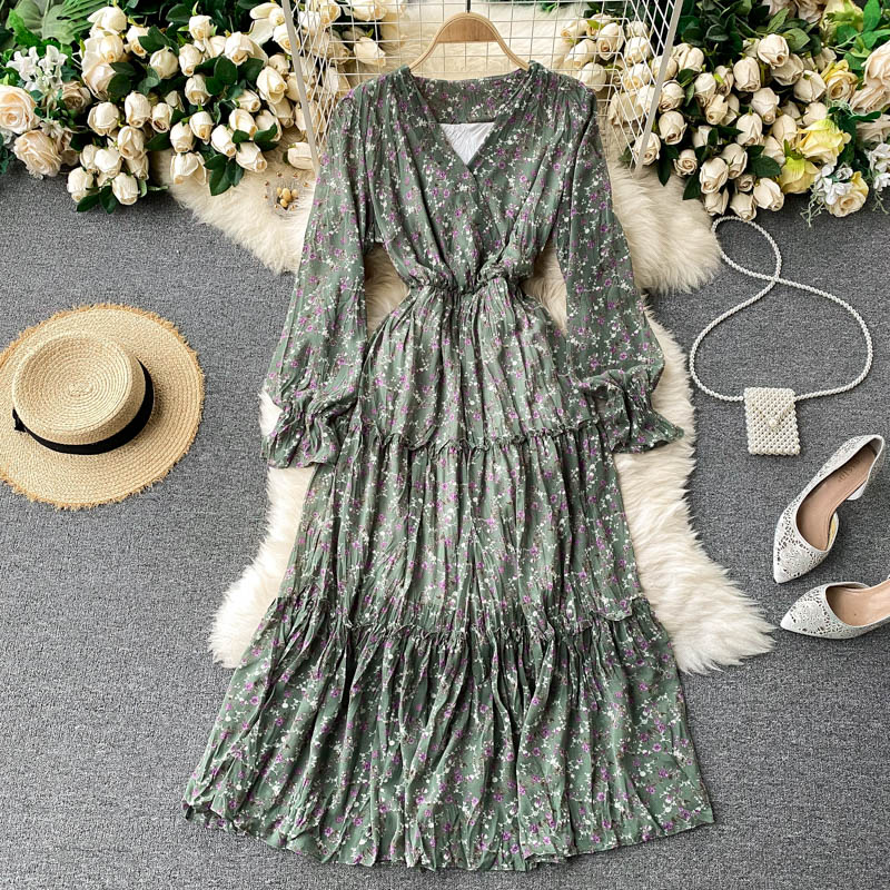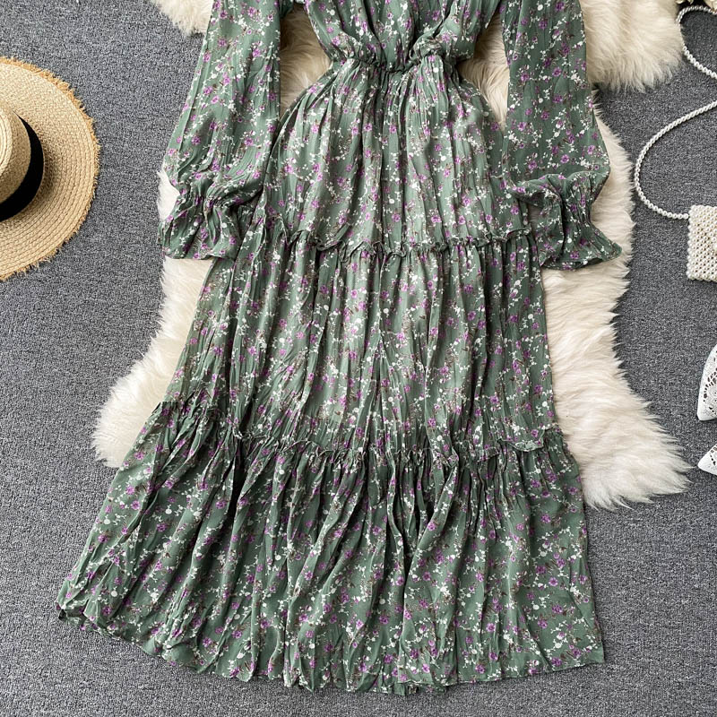 Spring Autumn Green/Blue/Beige/Black Flower Printed Draped Midi Dress Women Elegant V-Neck Flare Long Sleeve Casual Vestidos New