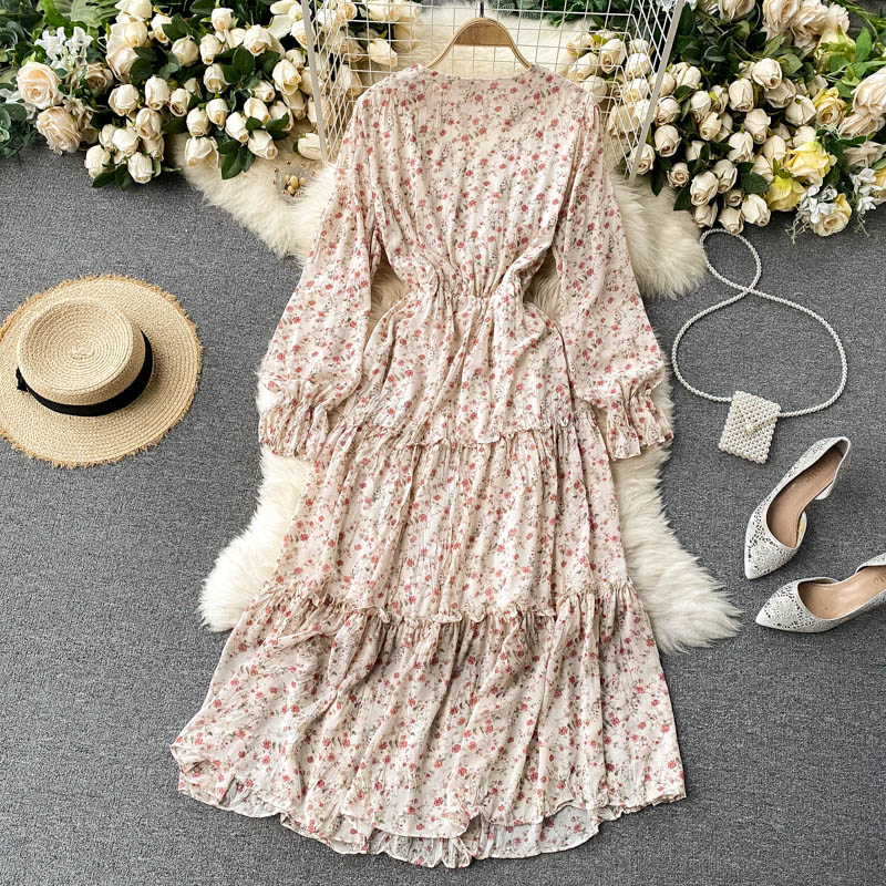 Cheap Dresses, Buy Quality Women’s Clothing Directly from China Suppliers:Spring Autumn Green/Blue/Beige/Black Flower Printed Draped Midi Dress Women Elegant V Neck Flare Long Sleeve Casual Vestidos New
