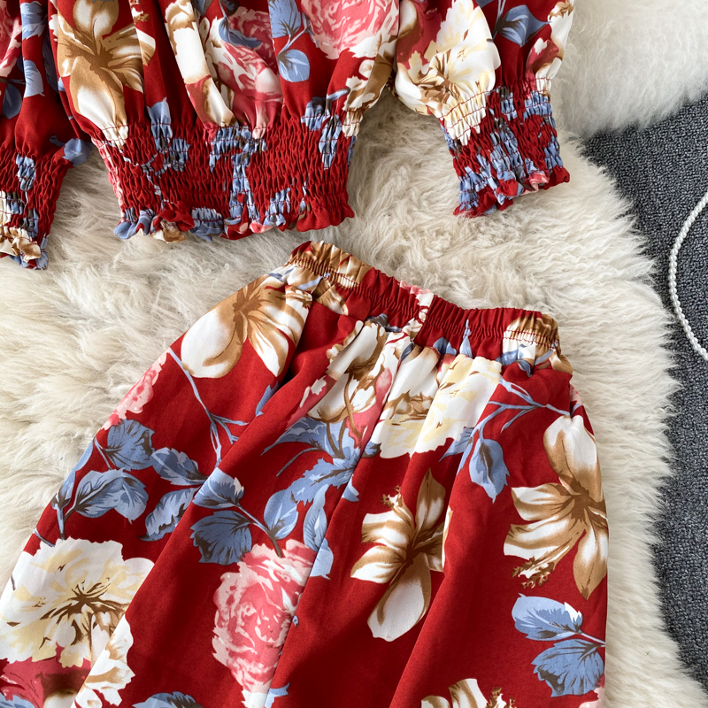 Summer Bohemian Vacation Beach 2pcs Set Women Sexy Slash Neck Short Sleeve Tops + High Waist Wide Leg Pants Two Piece Suit New