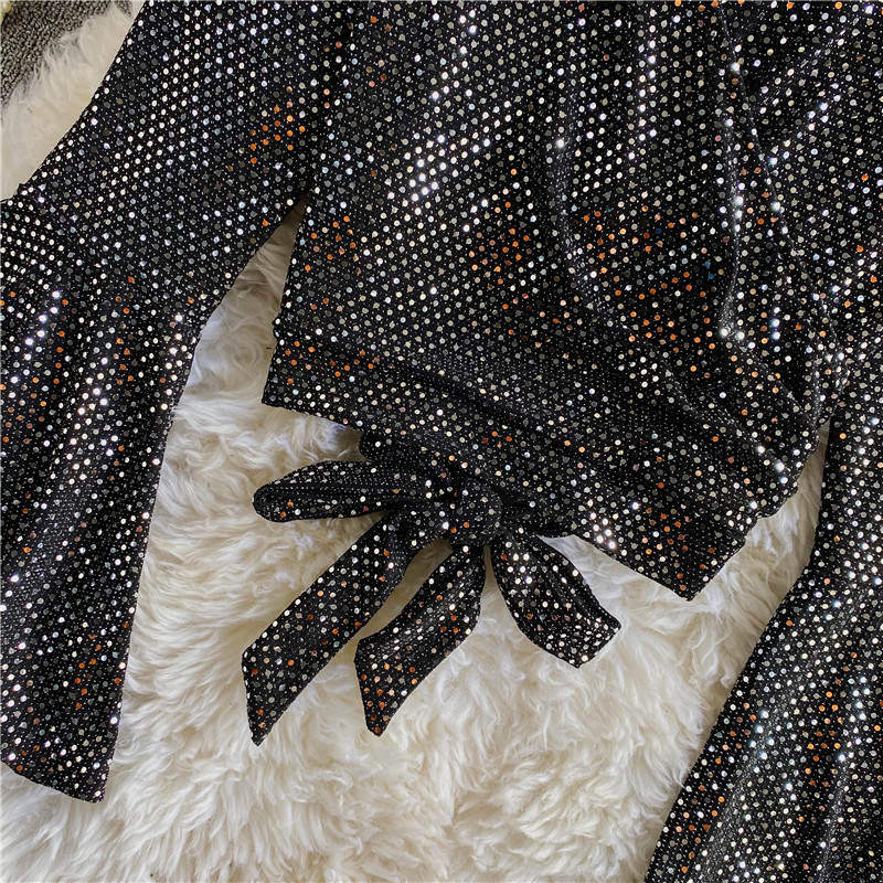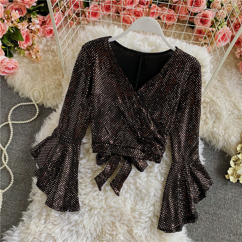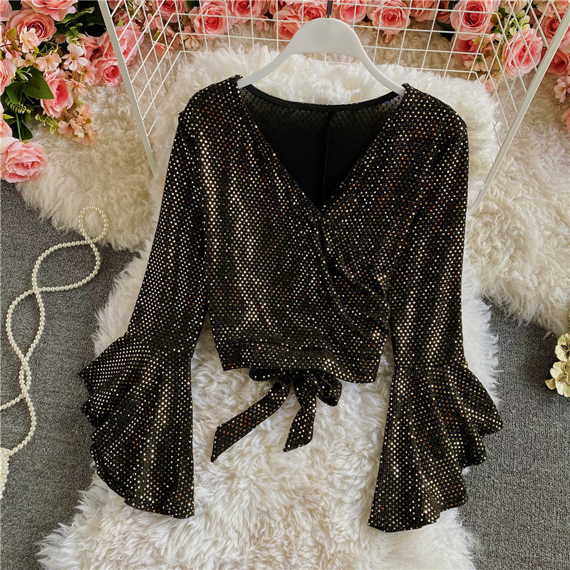 Black/Gold Bling Blouse Women Sexy V-Neck Flare Long Sleeve Bandage Shirt Female Slim Vintage Tops Elegant Blusas Spring Autumn